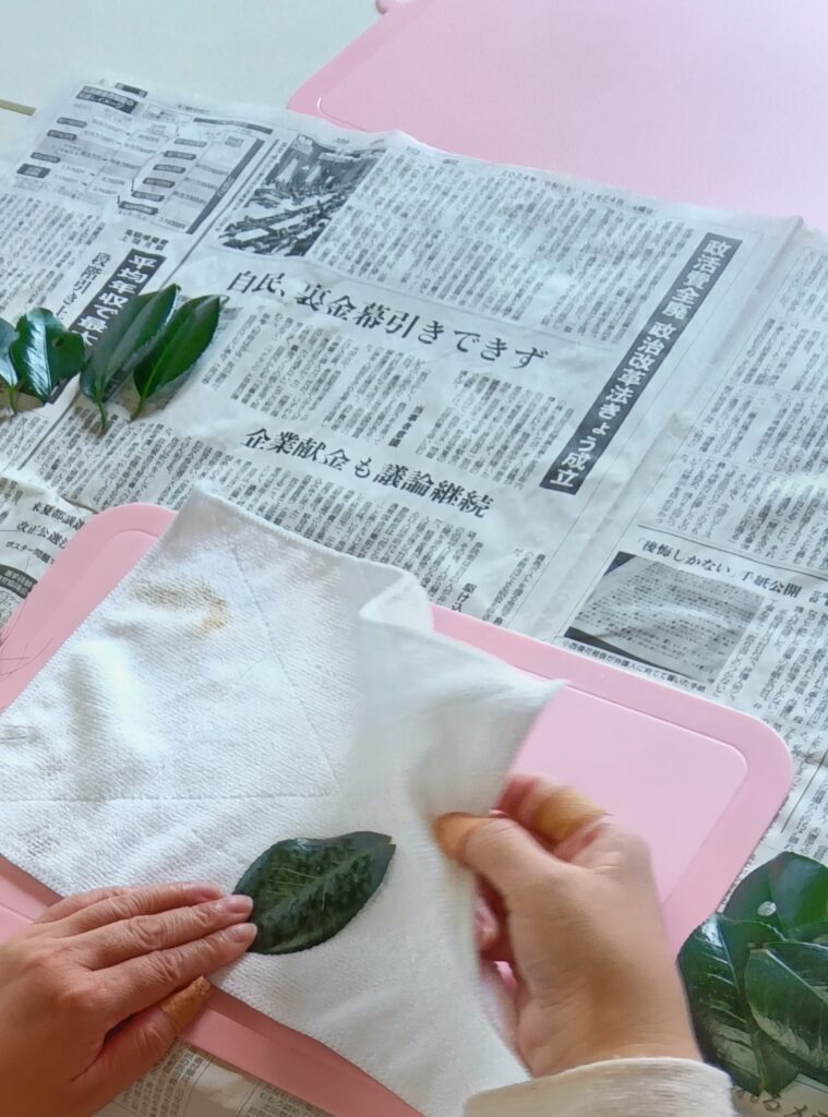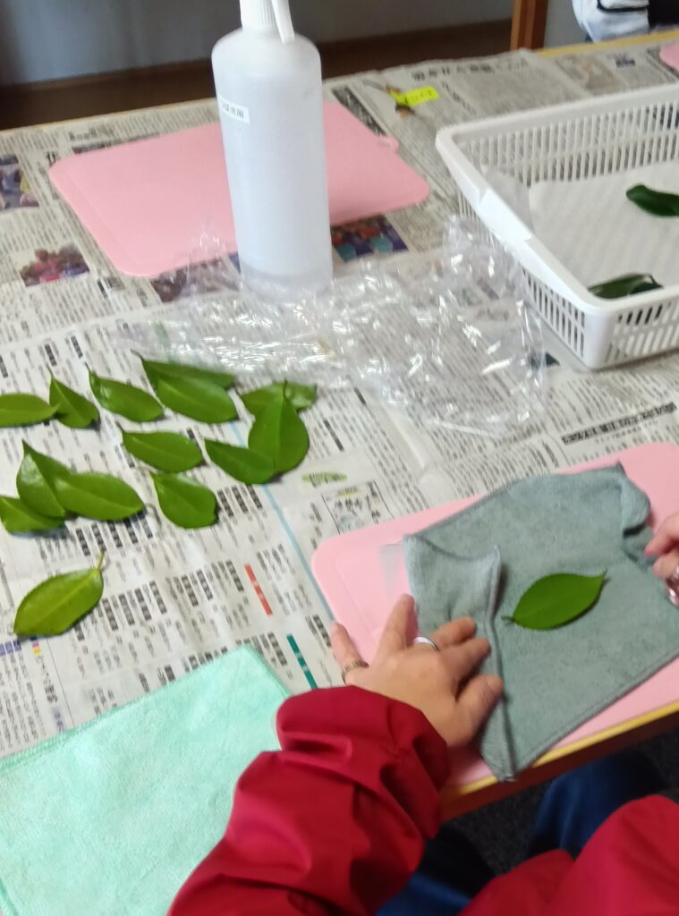 切り取った葉を丁寧に何度も水拭きし、最後に乾拭きします。