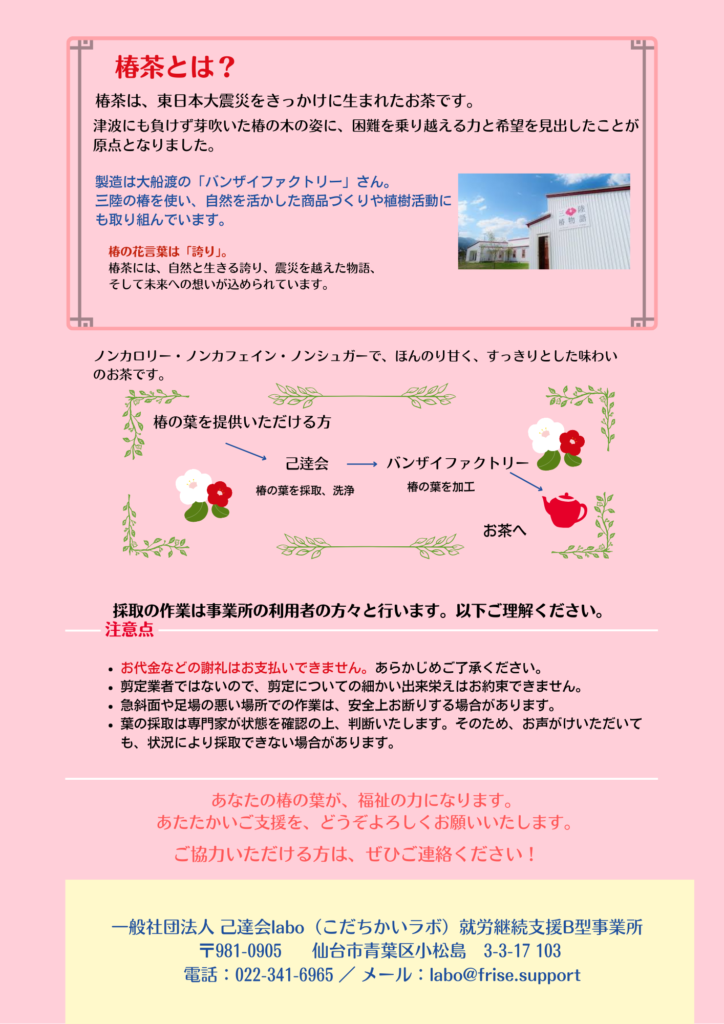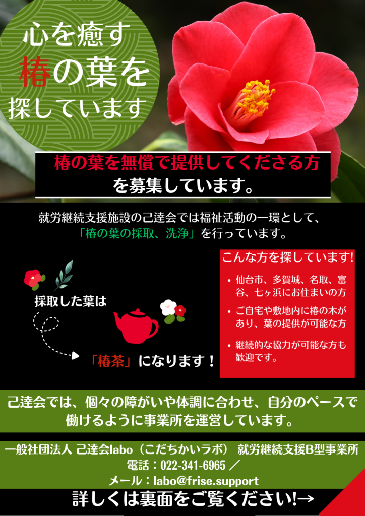 己達会laboでは三陸沿岸部でツバキの葉を提供してくれる方を募集しております。
