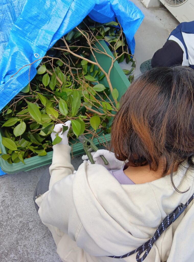 宮城県内の神社で採取をし己達会labo施設にツバキの枝を運び込み、枝から葉を切り離します。