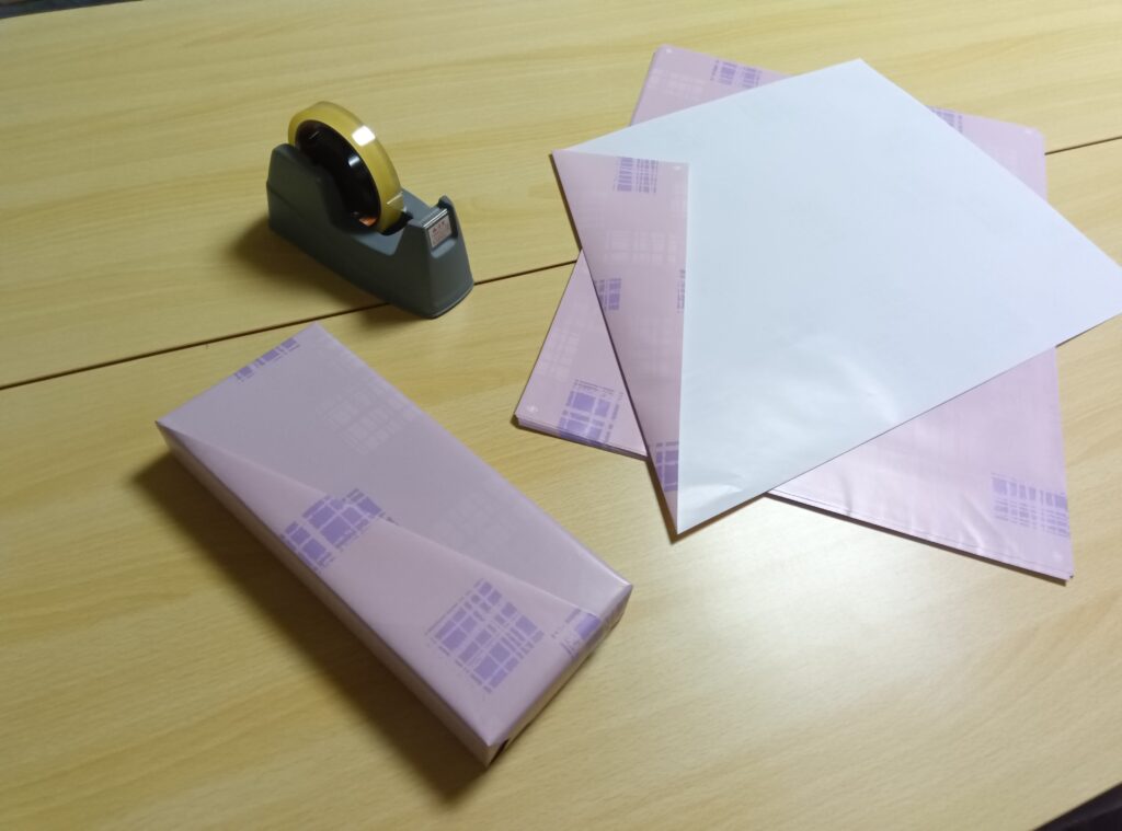 最後はお菓子の箱を綺麗に包装紙で包んで完成です。包装紙の角をピシッと合わせるのって、意外と指先に神経を使いますよね。その丁寧なひと手間があるからこそ、包みを開ける瞬間のワクワクがさらに特別なものになるんだと思います。本当にお疲れ様でした!