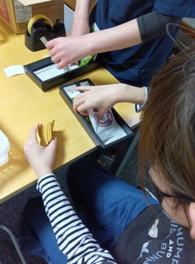 私たち「己達会labo」は、松和産業さまのお菓子を組み立てた紙の箱に中に入れ、包装する作業に取り組みました。